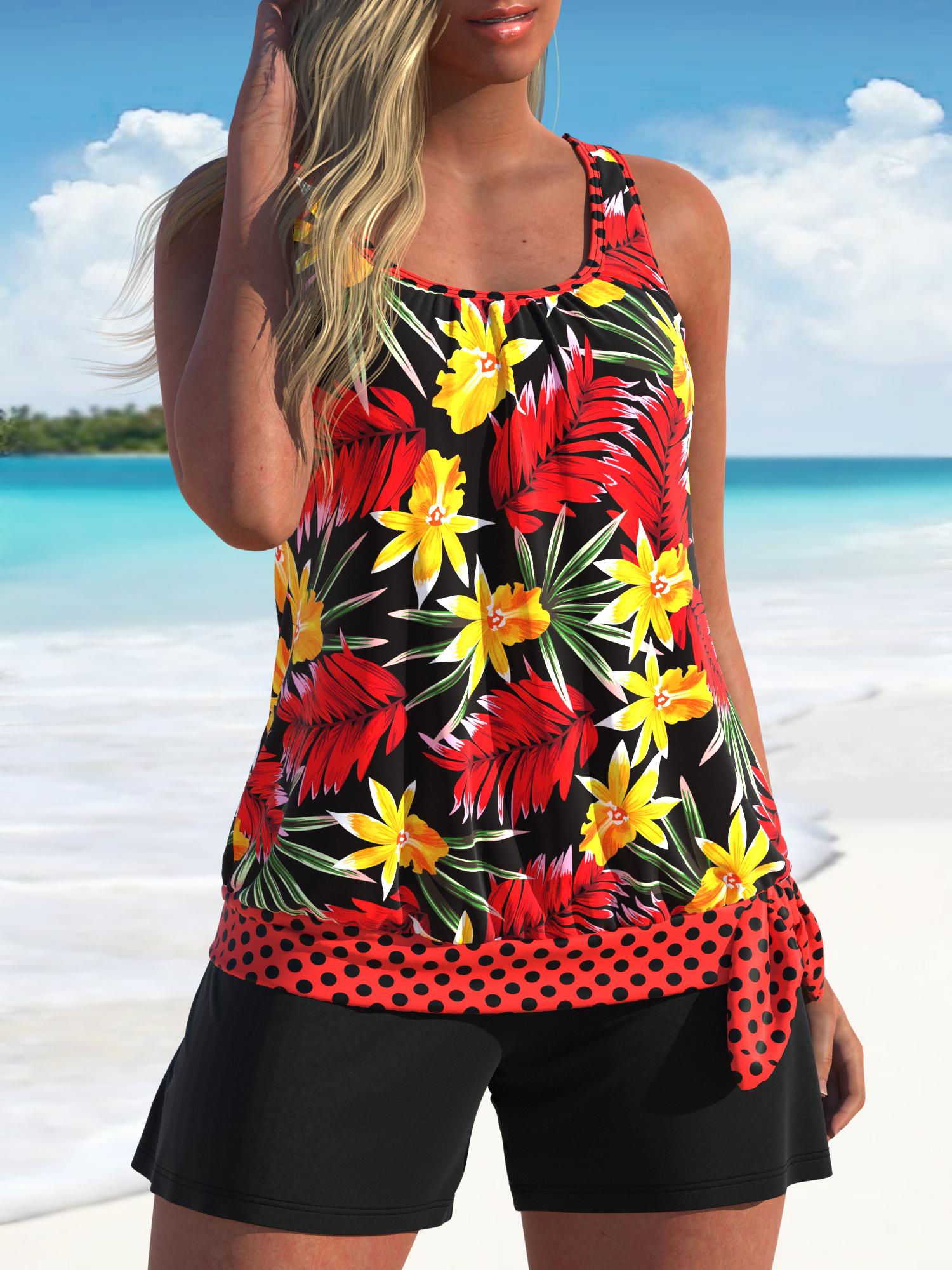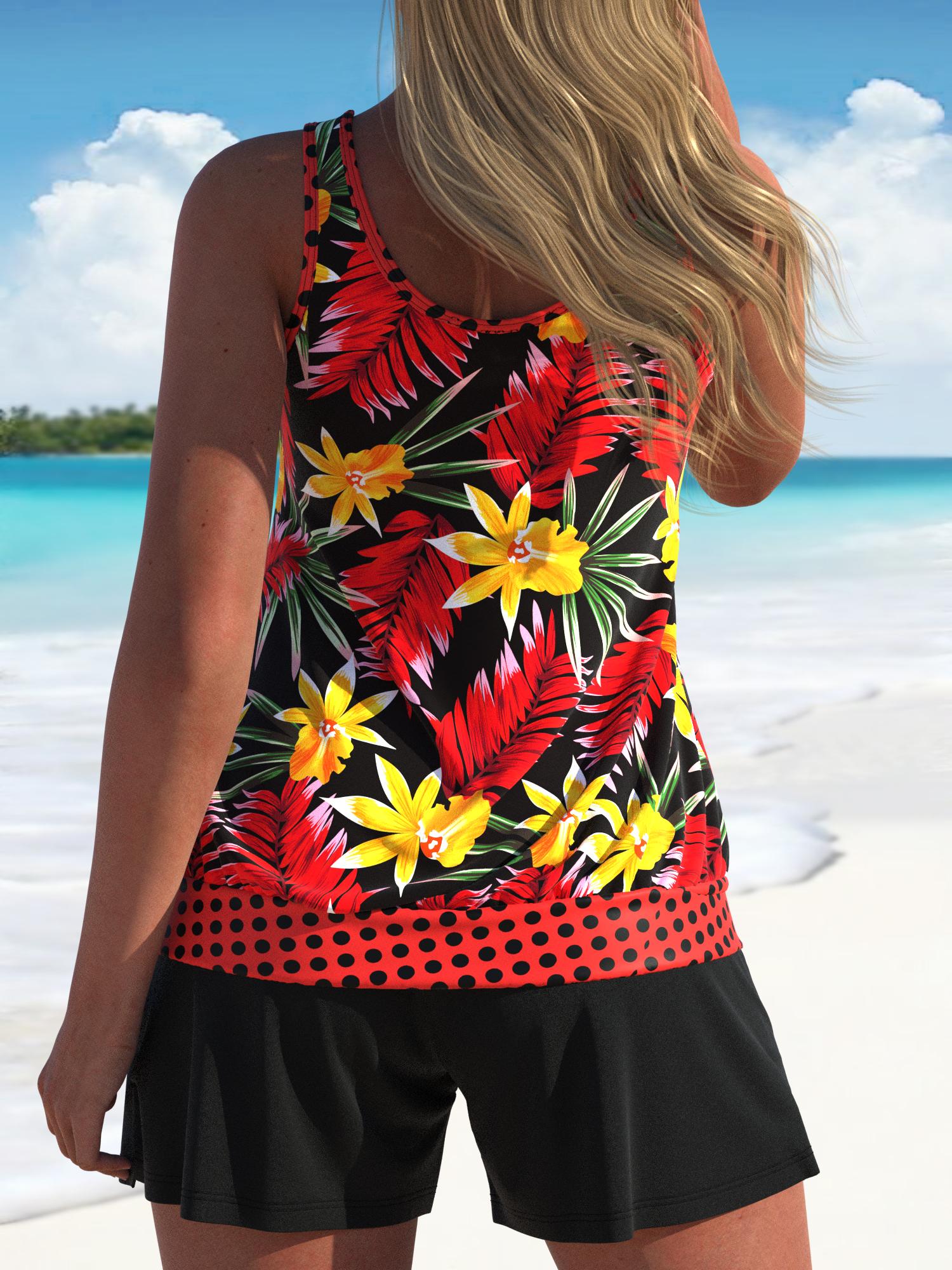 QKS9203-03 Fashion Red Leaf Yellow Flower Printed Tankini Beach Women's Large Swimsuit Set
