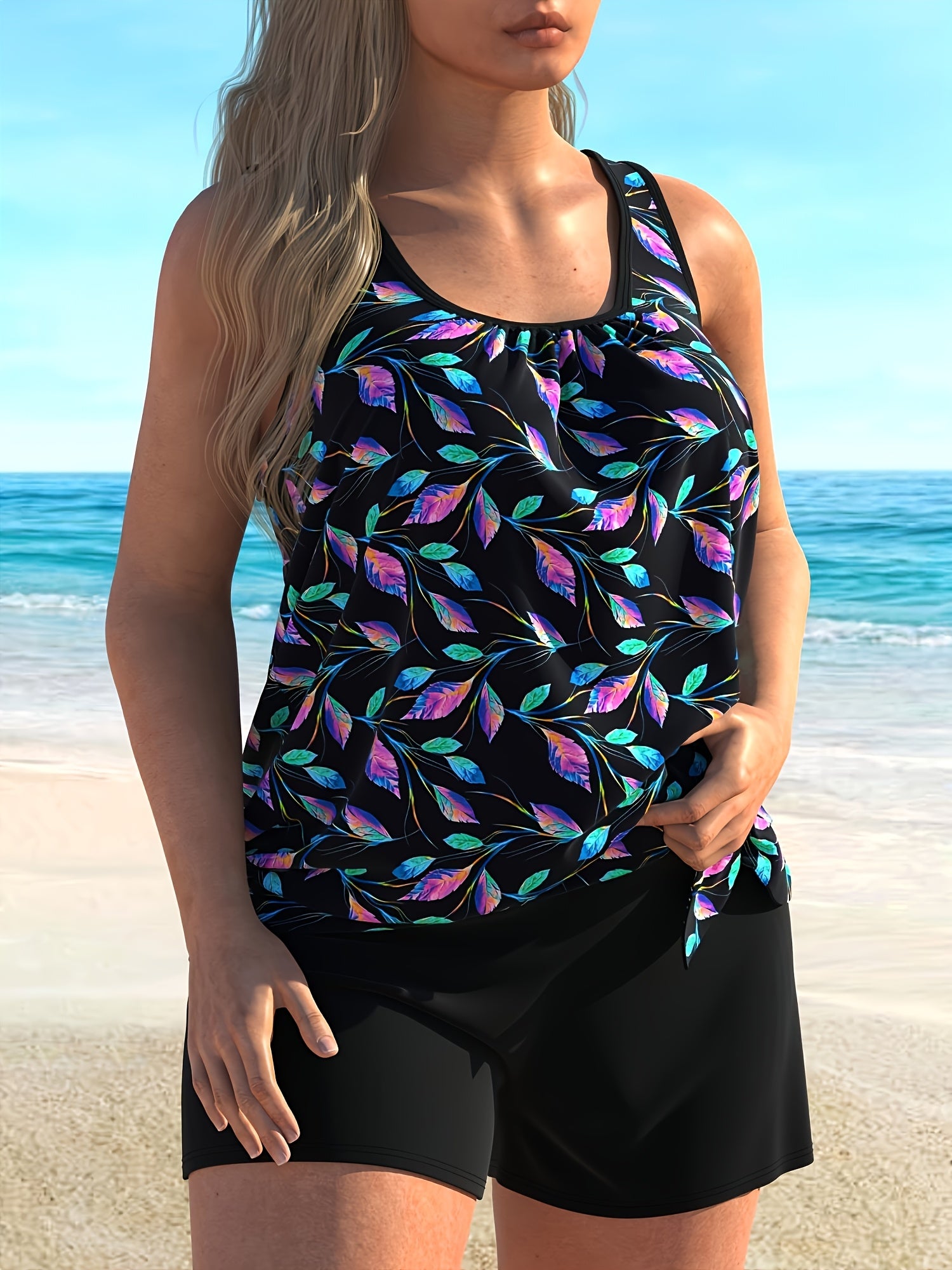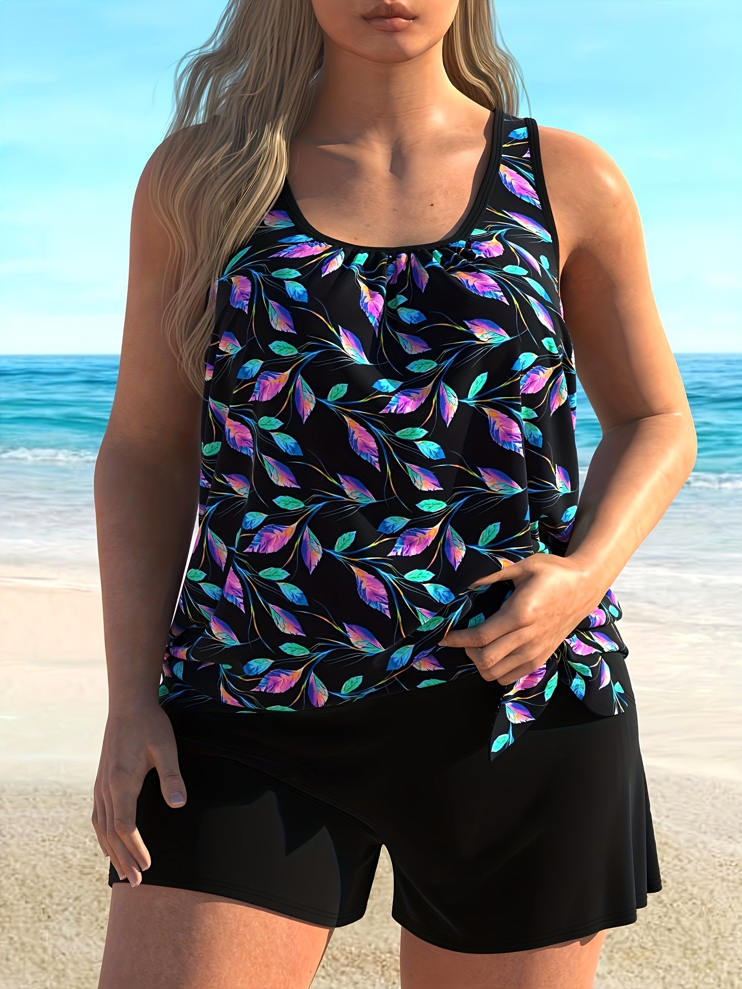 This Womens Blue Printed Tankini Swimsuit Set offers a blend of style and functionality, making it perfect for various beach activities including swimming, sunbathing, snorkeling, and more. Its dual-color design ensures you stand out while staying comfortable. Comfortable Fit: Designed specifically for women, this tankini comes with adjustable straps and a supportive built-in bra that provides optimal comfort without compromising on support. Enjoy your day by the water knowing you have a secure fit. High-Quality Fabric: Crafted using premium materials, this swimsuit set guarantees durability and comfort during extended wear. The fabric resists fading and retains its shape over time, providing long-lasting enjoyment at every pool party or beach outing. Sustainable Choice: Committed to environmental responsibility, our Womens Tankini Swimsuit Set adheres to sustainable production practices. You can enjoy fashionably eco-friendly swimwear options without sacrificing on style or performance. Chic Style Options: Available in multiple sizes, this blue and black printed tankini suit allows you to choose the one that best fits your body type. Pair it with matching accessories like sunglasses and hats to complete an effortlessly chic look