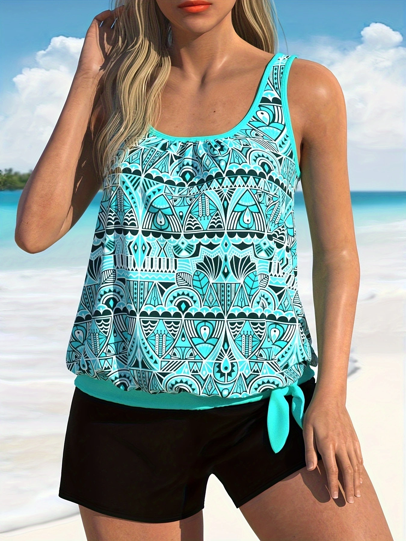 This Womens Blue Printed Tankini Swimsuit Set offers a blend of style and functionality, making it perfect for various beach activities including swimming, sunbathing, snorkeling, and more. Its dual-color design ensures you stand out while staying comfortable. Comfortable Fit: Designed specifically for women, this tankini comes with adjustable straps and a supportive built-in bra that provides optimal comfort without compromising on support. Enjoy your day by the water knowing you have a secure fit. High-Quality Fabric: Crafted using premium materials, this swimsuit set guarantees durability and comfort during extended wear. The fabric resists fading and retains its shape over time, providing long-lasting enjoyment at every pool party or beach outing. Sustainable Choice: Committed to environmental responsibility, our Womens Tankini Swimsuit Set adheres to sustainable production practices. You can enjoy fashionably eco-friendly swimwear options without sacrificing on style or performance. Chic Style Options: Available in multiple sizes, this blue and black printed tankini suit allows you to choose the one that best fits your body type. Pair it with matching accessories like sunglasses and hats to complete an effortlessly chic look