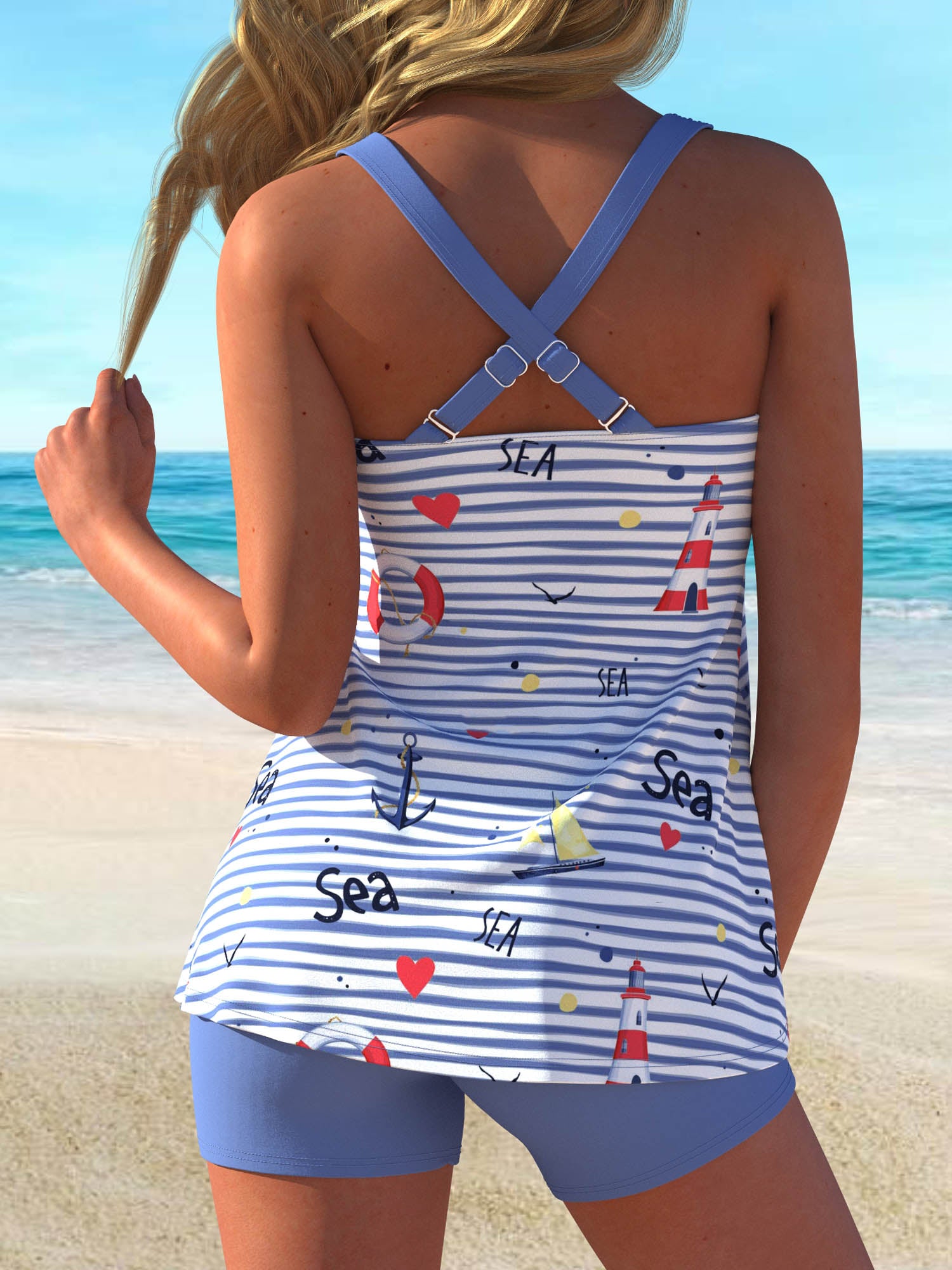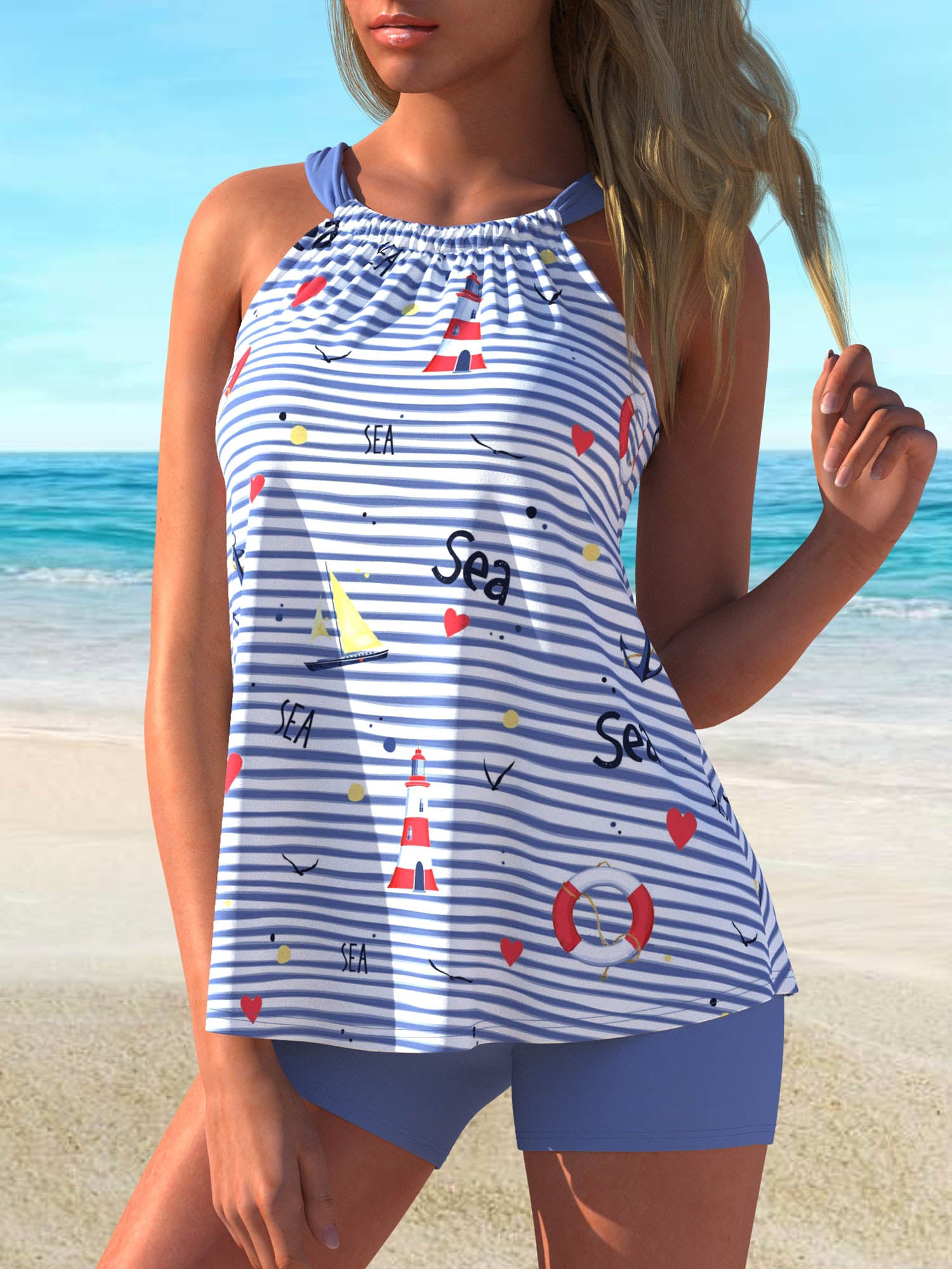 QKSA601-04Fashion Light Blue Striped Printed Beach Party Tankini Swimsuit
