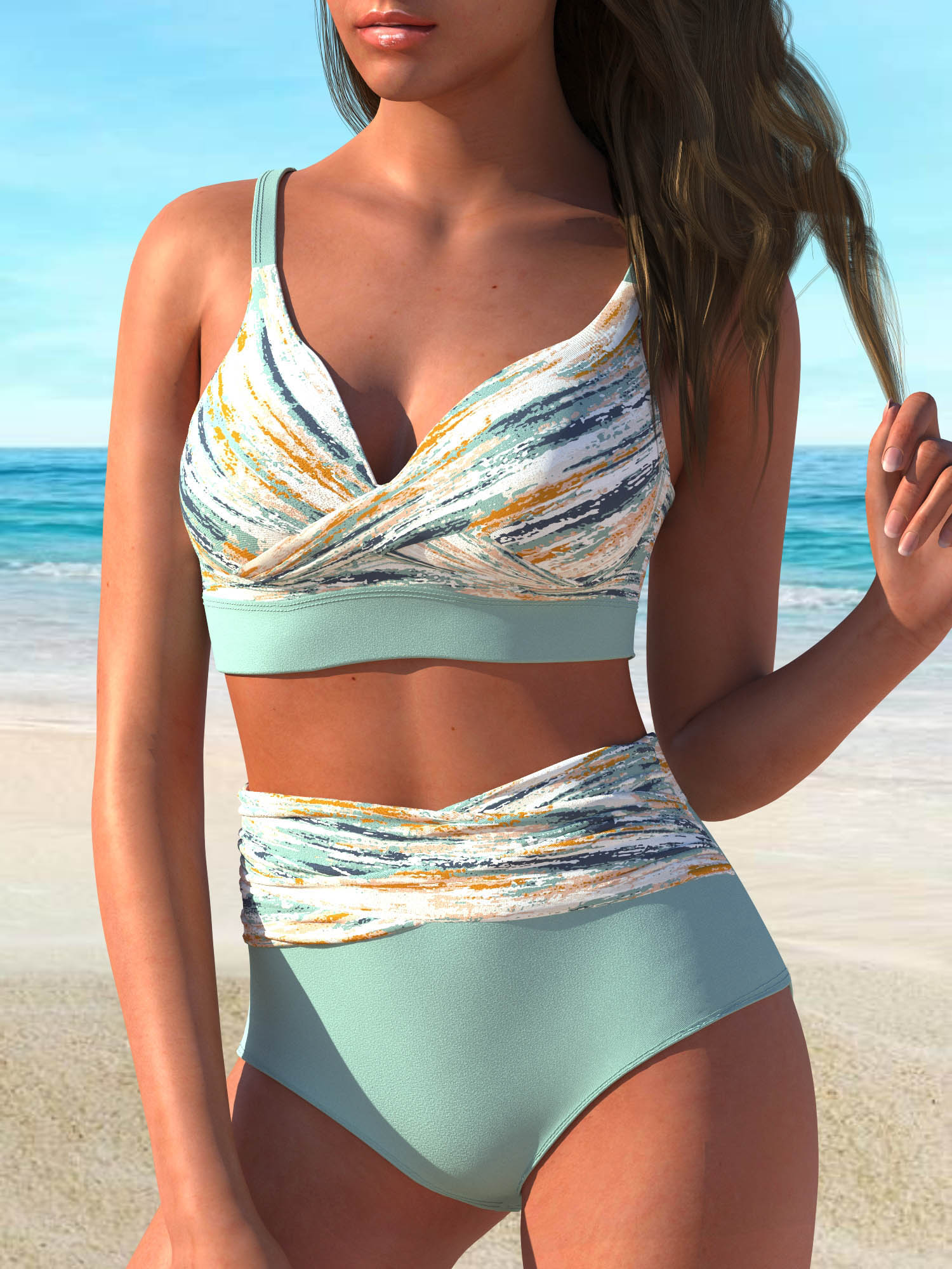QKSB57-07Fashion Light Green Striped Printed Seaside Party Women's Bikini Swimsuit