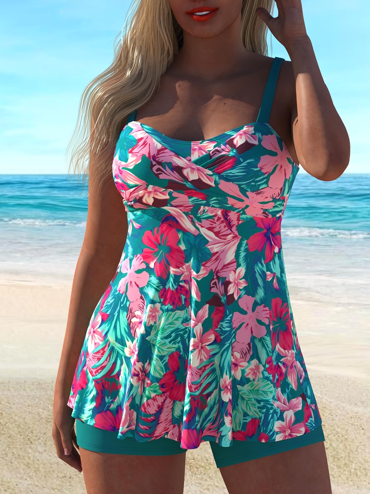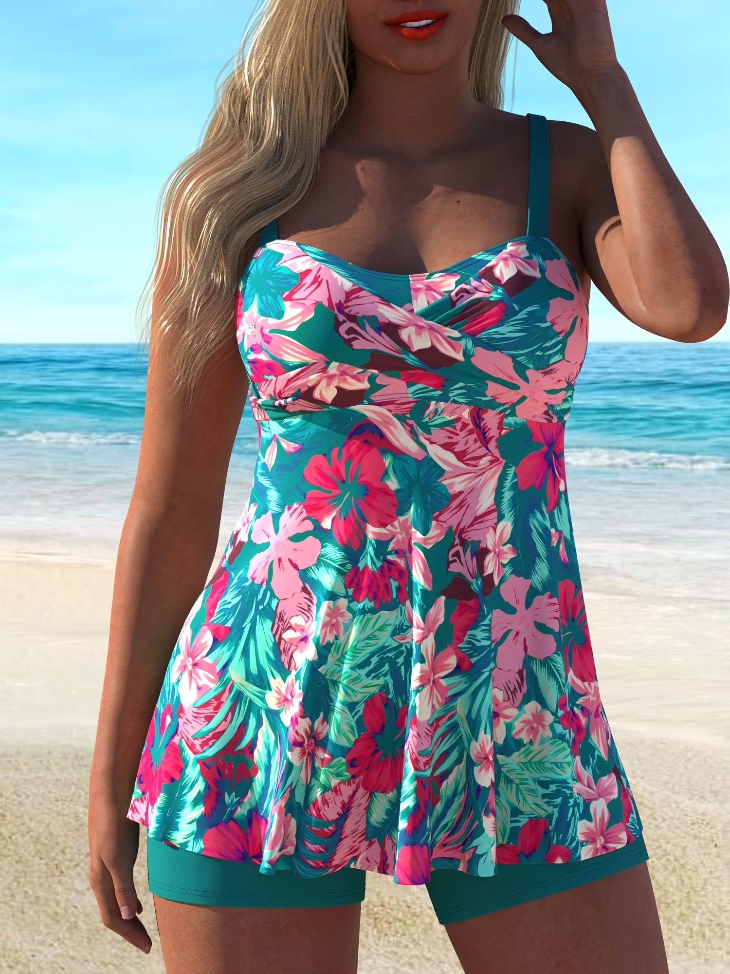 ASKA3-06 Fashion dark green tropical print women's plus size Tankini swimsuit set