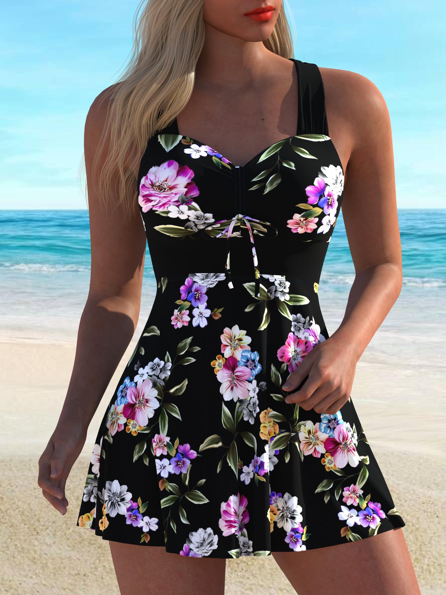 QKS69-16 Ladies' black background white flower printed Tankini casual swimsuit set