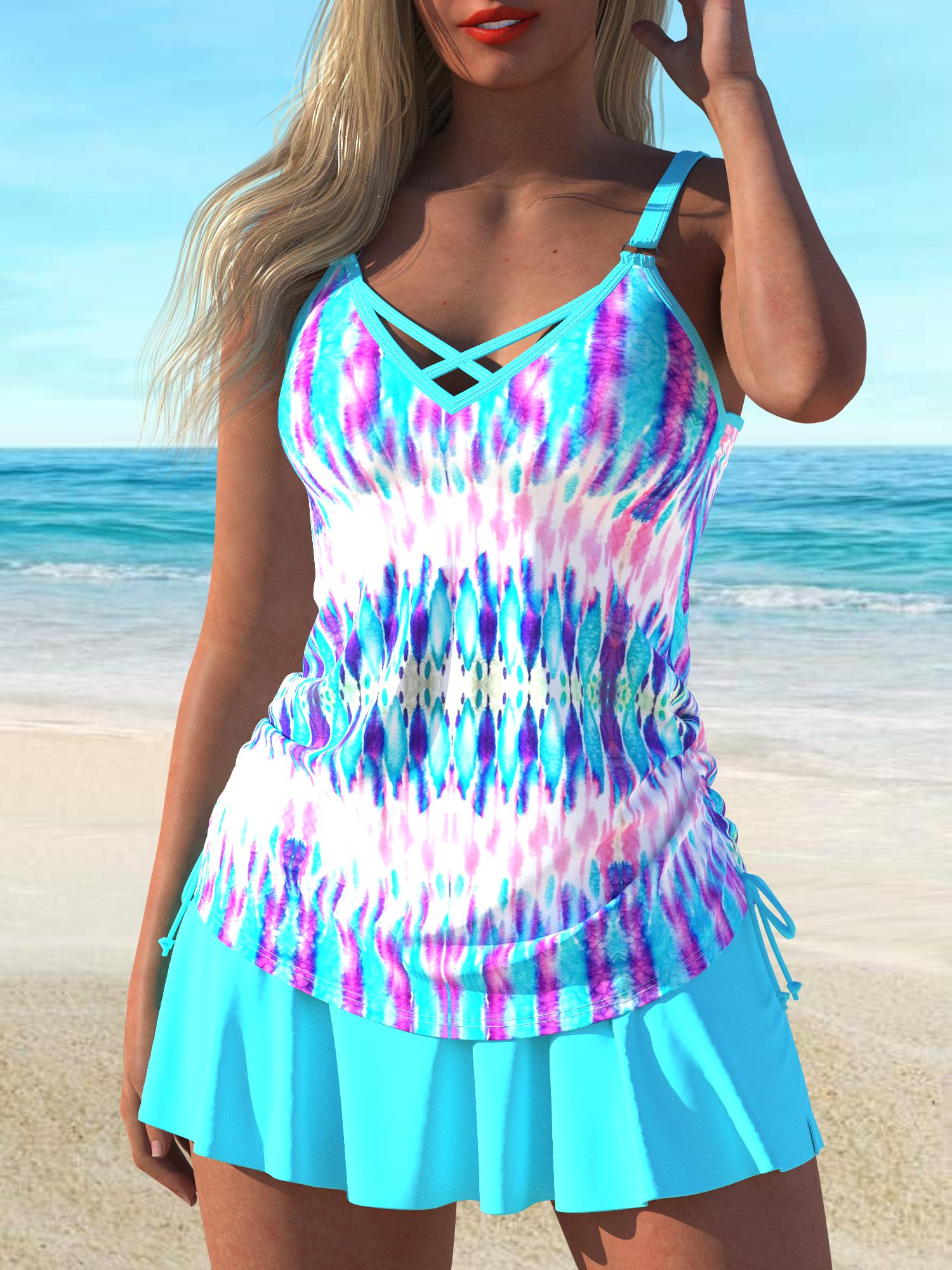 QKS08-03Fashion Women's V-Neck Cross Stripe Printed Tankini Swimsuit