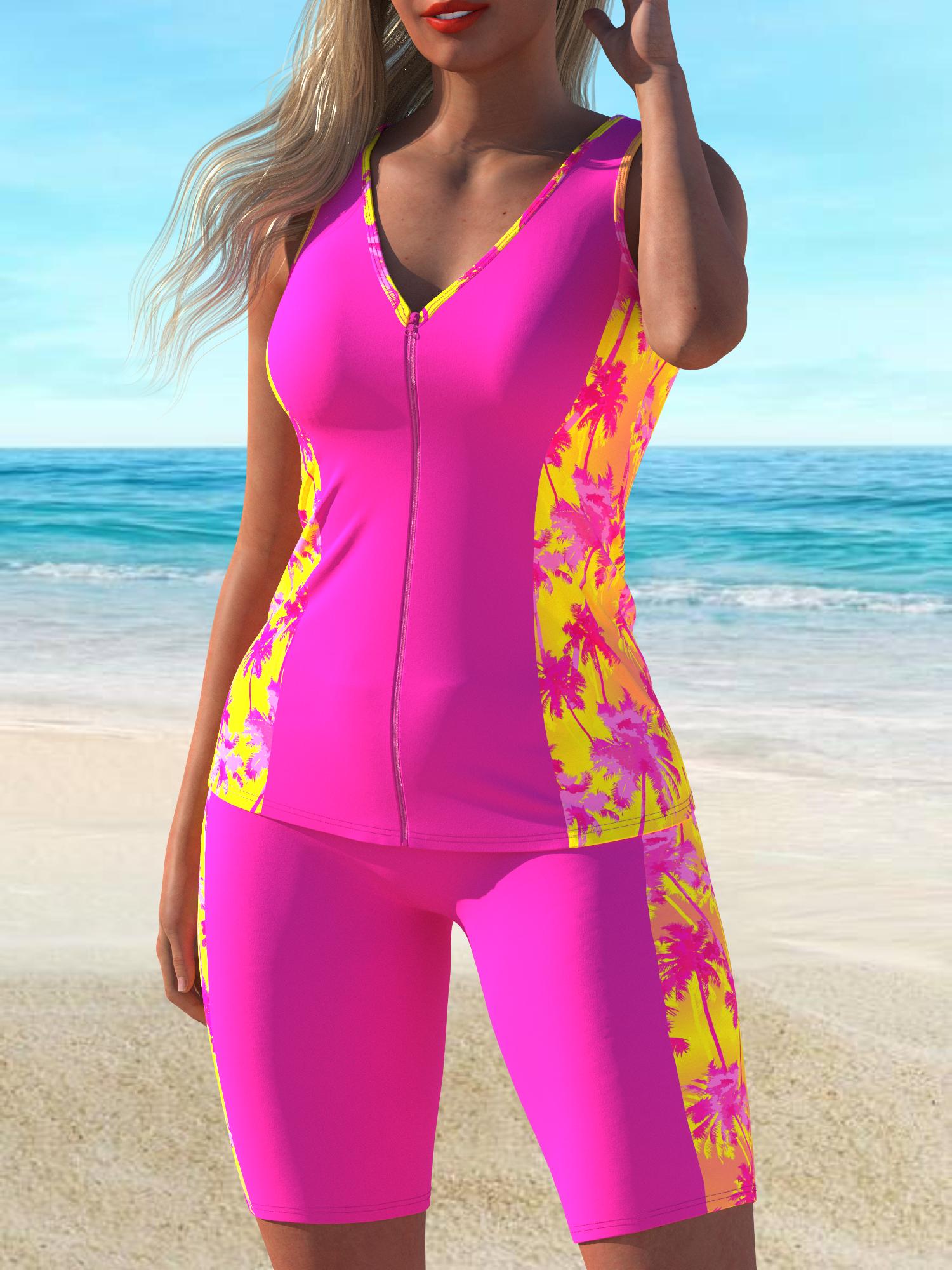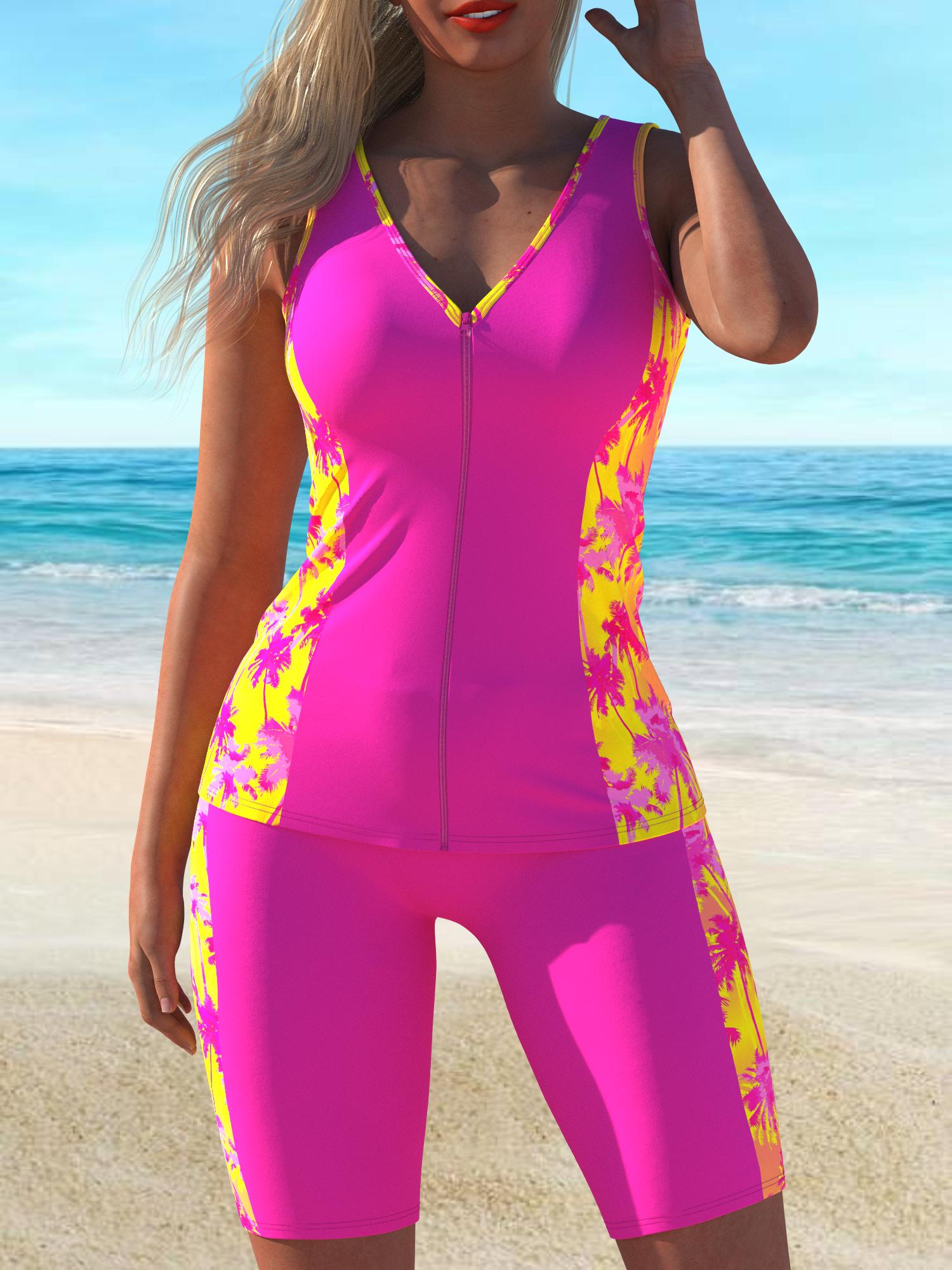 QKSA45-01Fashionable plant printed casual women's Tankini swimsuit