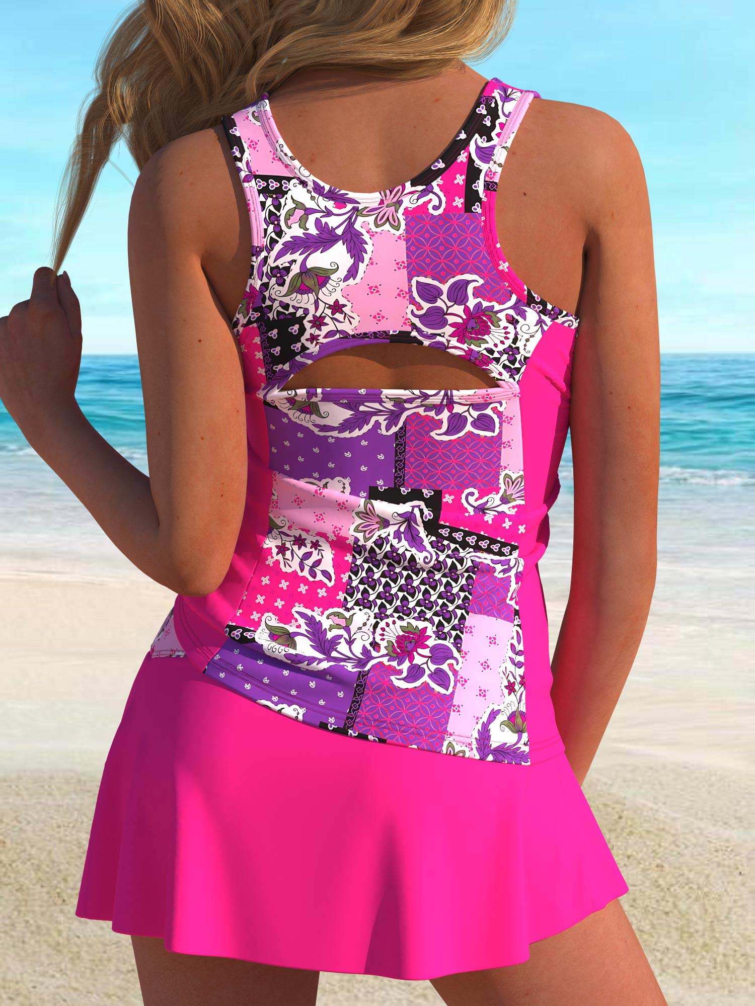 QKSA555-07Fashion Bright Pink Random Print Beach Party Tankini Swimsuit