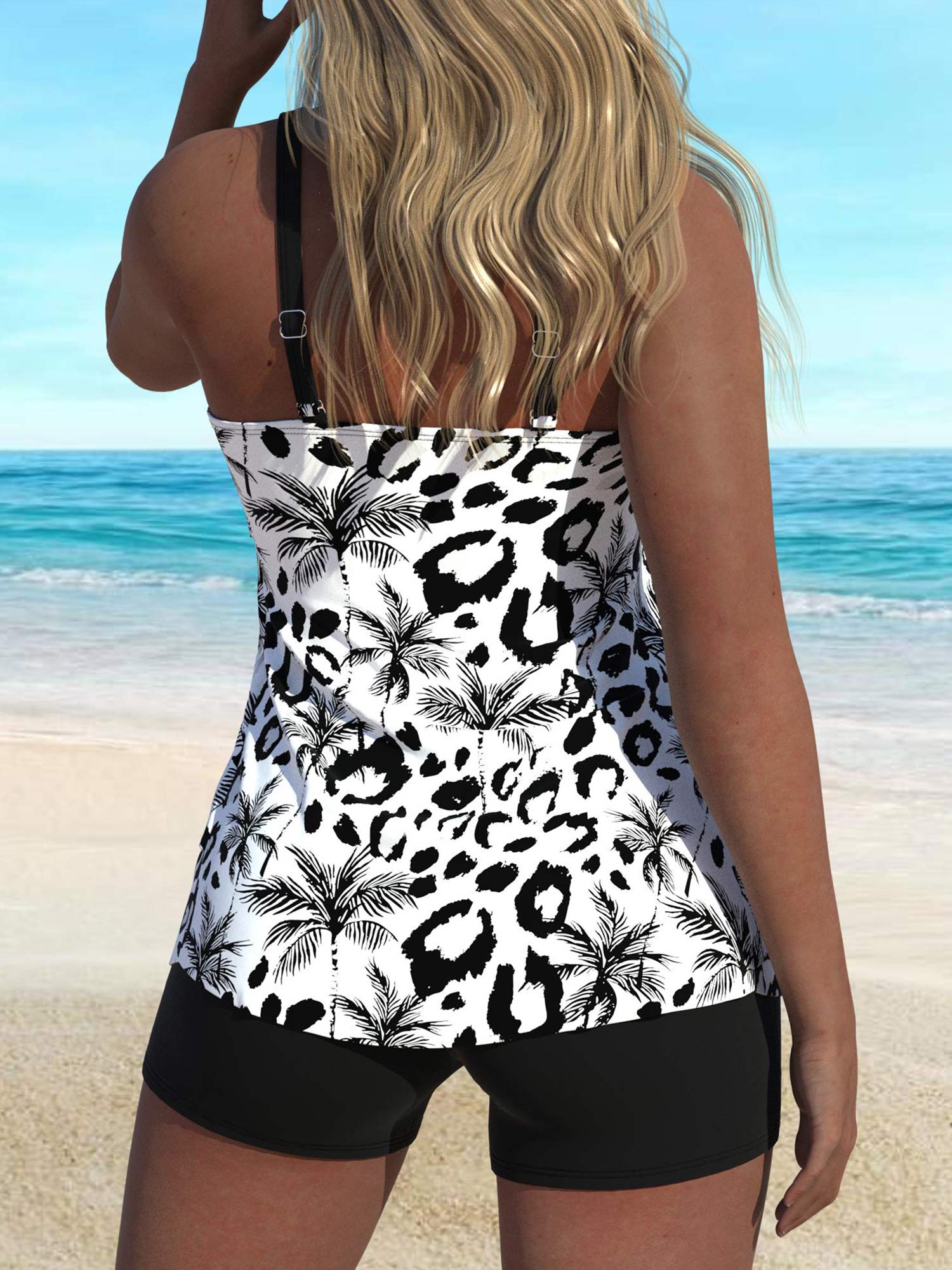 QKSA6-09Fashion Women's V-Neck Triple Skirt Coconut Print Tankini Swimsuit